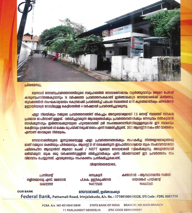 നമ്മളെല്ലാവരുടെയും ഊർജിതമായ സഹകരണം മൂലമാണ് ഈ ലക്ഷ്യം പൂർത്തീകരിക്കുന്നത്.അവസാന മിനുക്കുപണികൾക്കും മറ്റനുബന്ധ ചിലവുകൾക്കുമായി സേവാഭാരതി ഉദാരമതികളെ സമീപിക്കുകയാണ്.എത്ര ചെറിയ തുകയായാലും നമ്മുടെ പങ്കാളിത്തം എന്നത് വളരെ വലുതാണ്. താങ്കളുടെയും ബന്ധുമിത്രാദികളുടെയും സഹകരണം പ്രതീഷിക്കുന്നു.