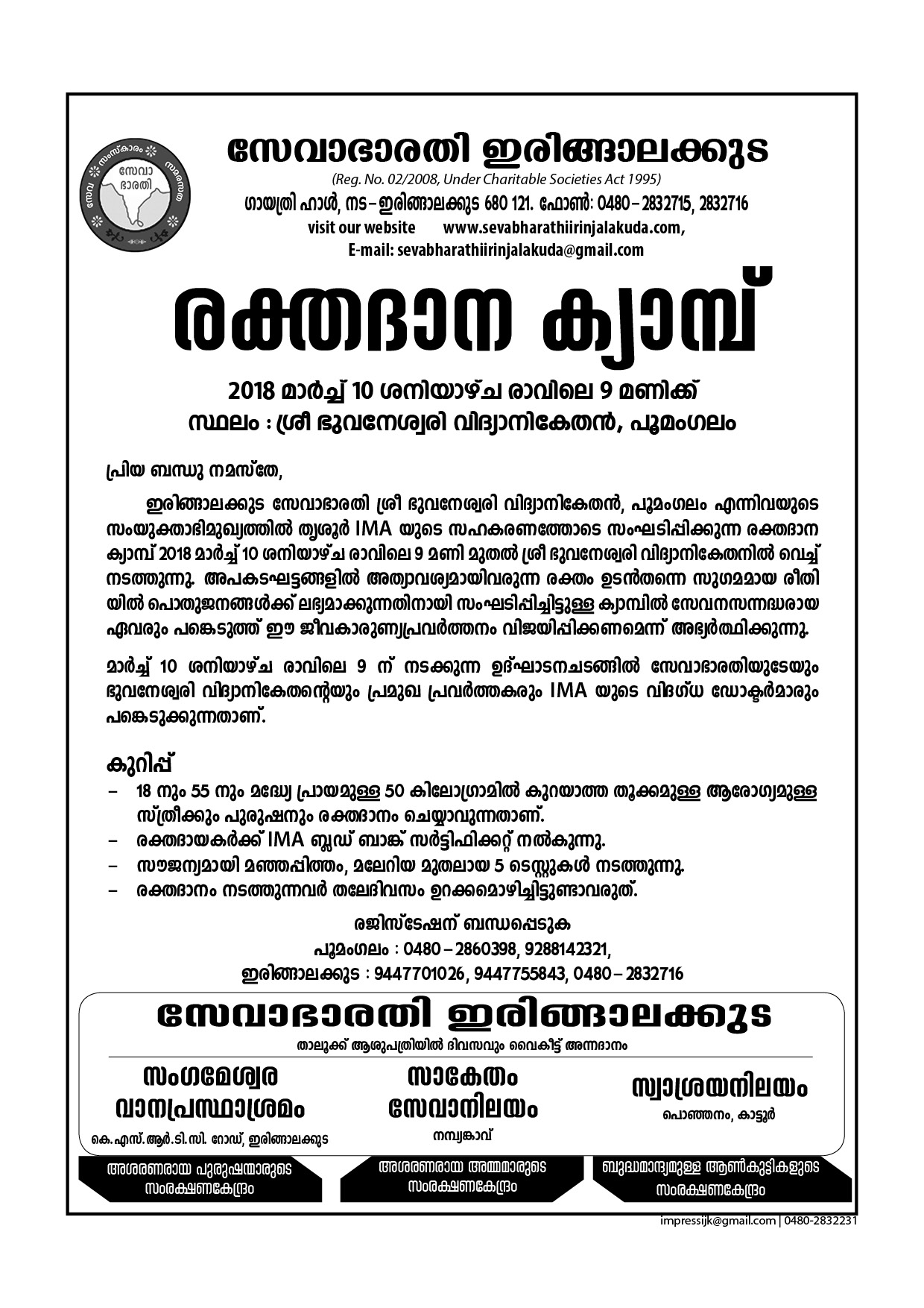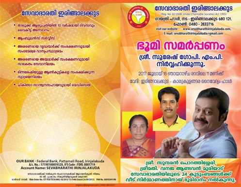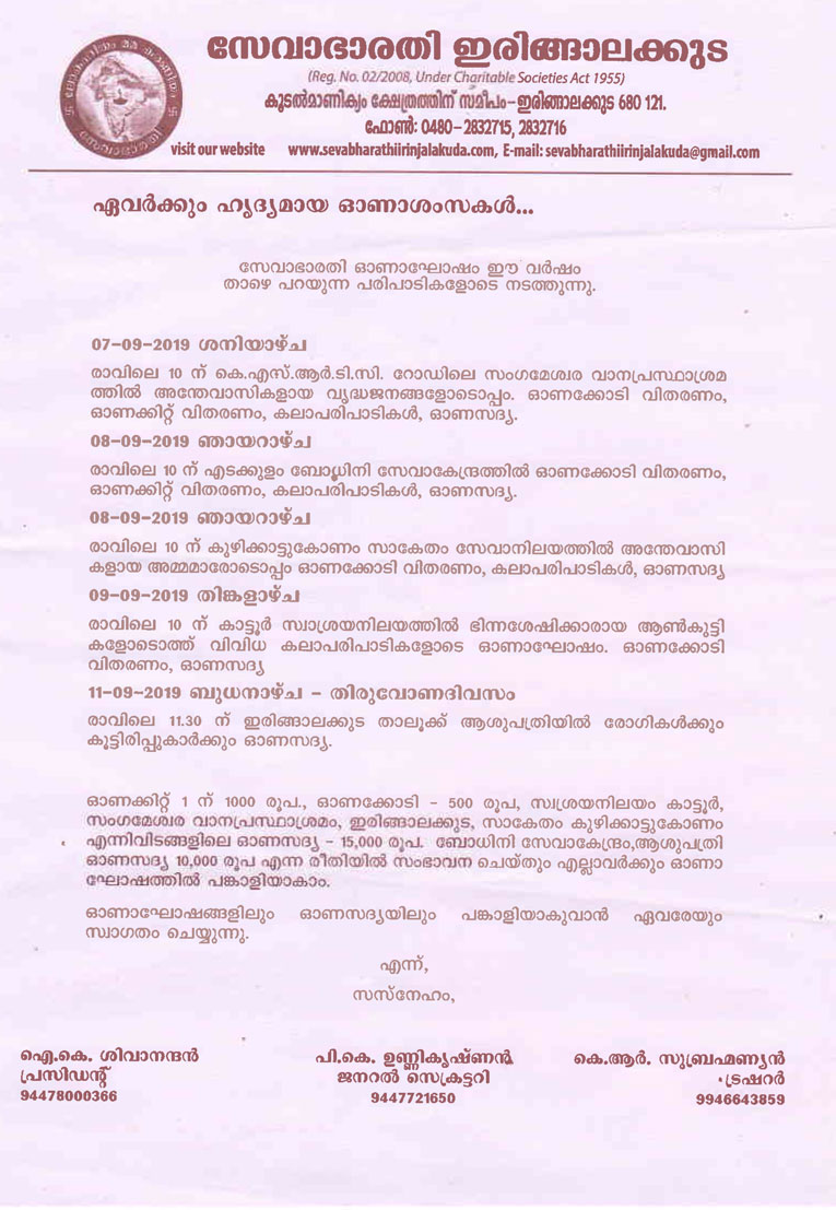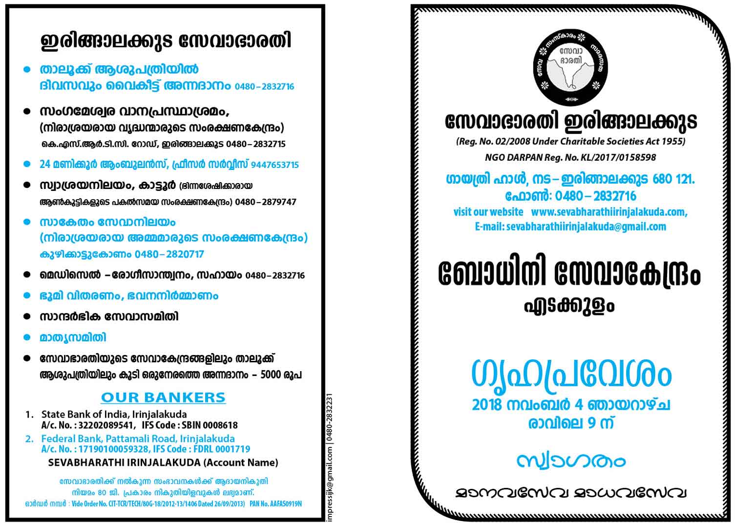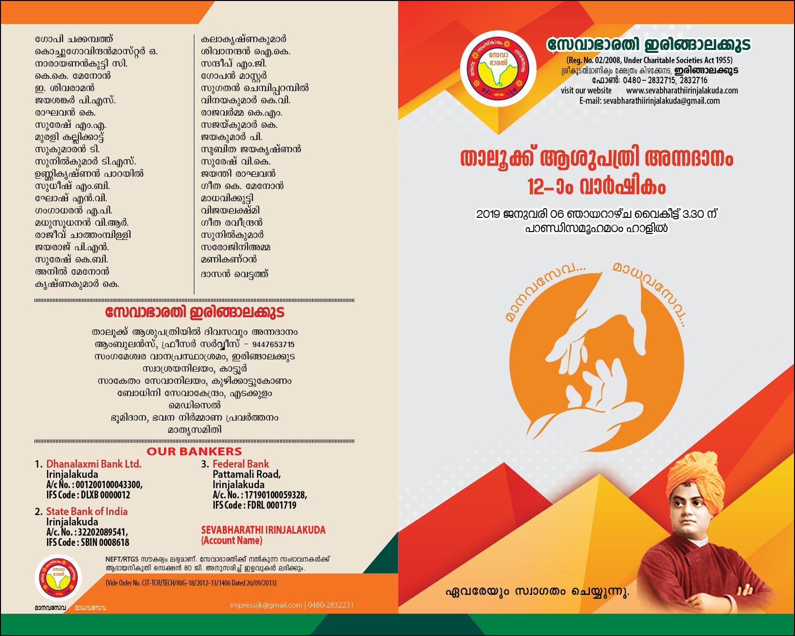 A/C Name : Sevabharathi Irinjalakuda A/C. NO. 17190100059328 Federal Bank Ltd., NADA, IRINJALAKUDA – 680121. IFSC code:FDRL0001719