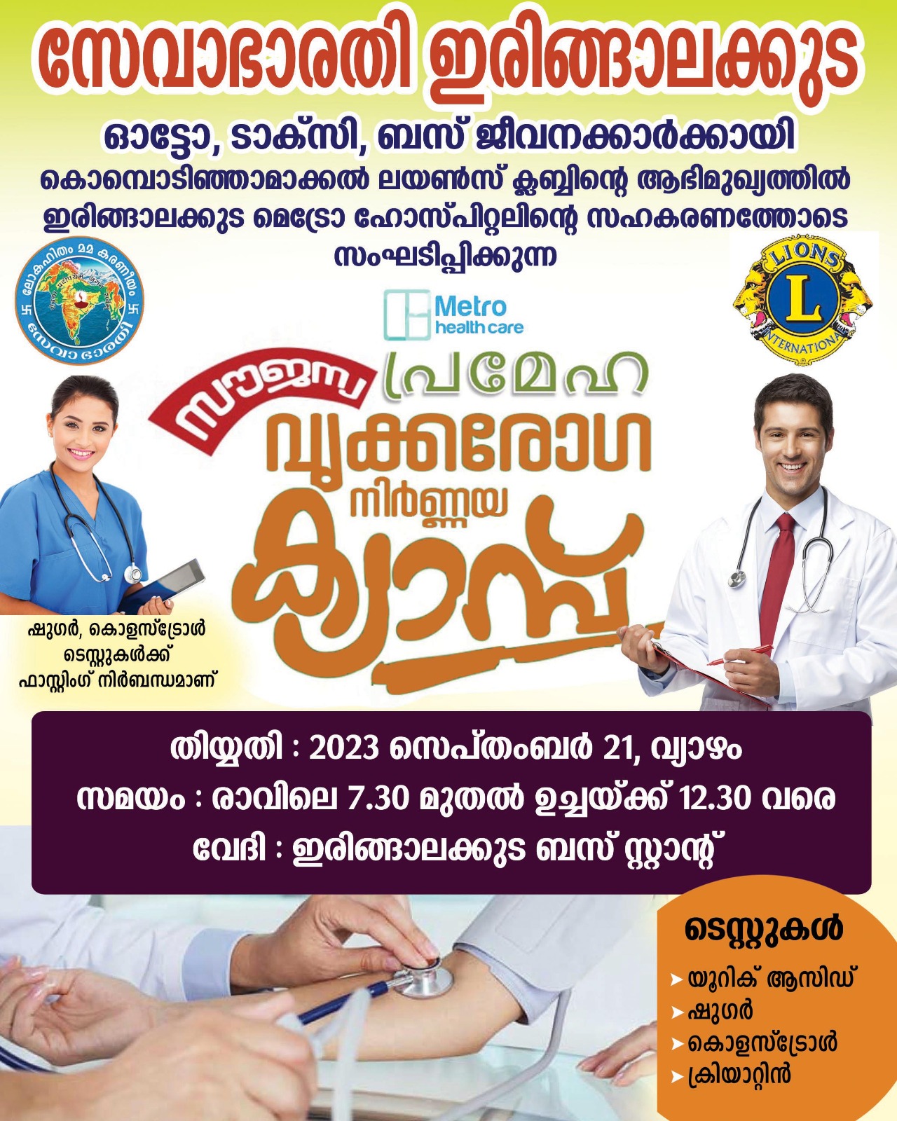 ഇരിങ്ങാലക്കുട സേവാഭാരതി , കൊമ്പാടിഞ്ഞാമാക്കൽ ലയൺസ് ക്ലബ് ആഭിമുഖ്യത്തിൽ ഇരിങ്ങാലക്കുട മെട്രോ ആശുപത്രിയുടെ സഹകരണത്തോടുകൂടി ഓട്ടോ-ടാക്സി , ബസ് ജീവനക്കാർക്ക് വേണ്ടി സൗജന്യ പ്രമേഹ, വൃക്ക രോഗനിർണയ ക്യാമ്പ് നടത്തി