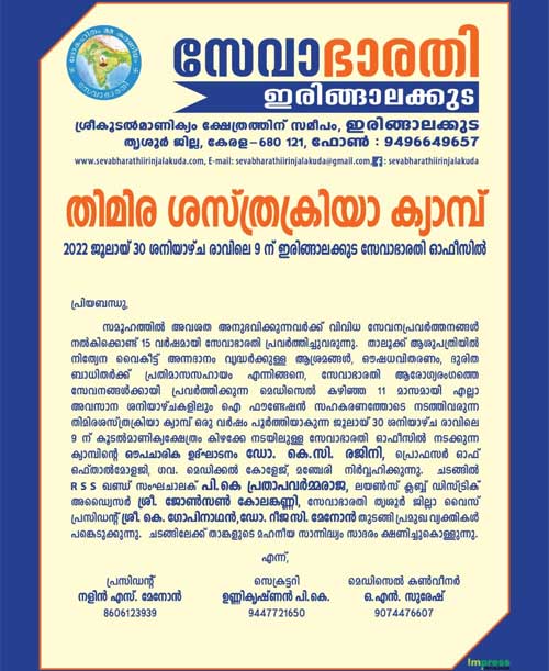 ക്യാമ്പും ജനറൽ മെഡിസിനും ഡിസംബർ 28 ശനിയാഴ്ച രാവിലെ 9 മുതൽ 1 മണി വരെ ഇരിങ്ങാലക്കുട സേവാഭാരതി ഓഫീസിൽ സംഘടിപ്പിക്കും. ബന്ധപ്പെടേണ്ട നമ്പർ 9496649657.