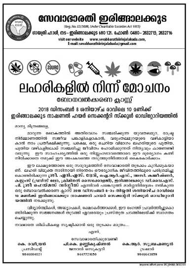 ഇരിങ്ങാലക്കുട സേവാഭാരതി "ലഹരികളിൽ നിന്ന് മോചനം" എന്ന മുദ്രാവാക്യവുമായി സെമിനാർ നടത്തി. കസ്റ്റംസ് അസിസ്റ്റന്റ് കമ്മീഷണർ ശ്രീ N. S. ദേവ് ക്ലാസ്സ് നയിച്ചു.നാഷണൽ ഹയർ സെക്കണ്ടറി സ്കൂൾ ഹാളിൽ നടന്ന പരിപാടിയിൽ സെന്റ് ജോസഫ്സ് കോളേജ് അസി.പ്രൊഫ. Dr. Srറോസ് ആന്റോ ,സ്കൂൾ മാനേജർ VPR മേനോൻ പ്രധാനാധ്യാപിക ഷീജ V, PTA പ്രസി.സന്തോഷ്, സേവാഭാരതി അംഗങ്ങളായ പ്രകാശൻ കൈമാപറമ്പിൽ, Vസായ് റാം,KRസുബ്രഹ്മണ്യൻ എന്നിവർ സന്നിഹിതരായിരുന്നു.