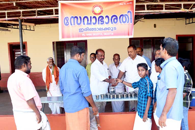 ഔദ്യോഗിക സംവിധാനങ്ങള് ദുരിതബാധിതരെ കൈയ്യൊഴിയുമ്പോഴും ഒരുവിധ അവകാശവാദങ്ങളുമില്ലാതെ സേവനം ധര്മ്മമെന്നനിലയിലാണ് ഇവര് ദുരന്തമുഖത്ത് സേവനമനുഷ്ഠിക്കുന്നത്. മൂന്ന് ആംബുലന്സുകള് മുഴുവന് സമയവും സേവനരംഗത്ത് സജീവമായി. സംഗമേശ്വര വാനപ്രസ്ഥാമശ്രമത്തില് ദുരന്ത ബാധിതര്ക്ക് സാമഗ്രികള് എത്തിക്കുന്നതിനായി സെന്റര് ഒരുക്കി പ്രവര്ത്തനങ്ങള് ഏകോപിപ്പിച്ചു. അമ്മമാരും കുട്ടികളുമുള്പ്പെടെ സെന്ററില് കിറ്റുകള് തയ്യാറാക്കാനും ഭക്ഷണ വിതരണത്തിനും മുന്നില് നിന്നു. സേവന പ്രവര്ത്തനങ്ങള്ക്ക് സേവാഭാരതി പ്രസിഡണ്ട് പി.കെ.ഉണ്ണികൃഷ്ണന്, ജനറല് സെക്രട്ടറി പി.ഹരിദാസ്, ഖണ്ഡ് കാര്യവാഹ് കെ.എസ്. സുനില്, സേവാപ്രമുഖ് പ്രമോദ് വെള്ളാനി, കെ.കെ.കണ്ണന്, കൃഷ്ണകുമാര്, സുധാകരന് സമീര തുടങ്ങിയവര് നേതൃത്വം നല്കി.