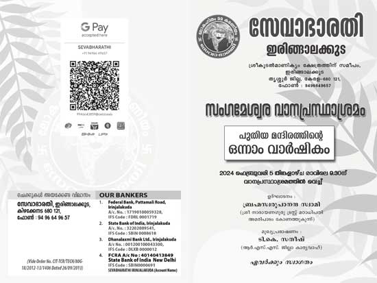 സേവാഭാരതി സംഗമേശ്വര വാനപ്രസ്ഥാശ്രമം പുതിയ മന്ദിരത്തിൻ്റെ ഒന്നാം വാർഷികം 2024 ഫെബ്രുവരി 5 തിങ്കളാഴ്ച രാവിലെ 9.30ന് വാനപ്രസ്ഥാശ്രമത്തിൽ വെച്ച്