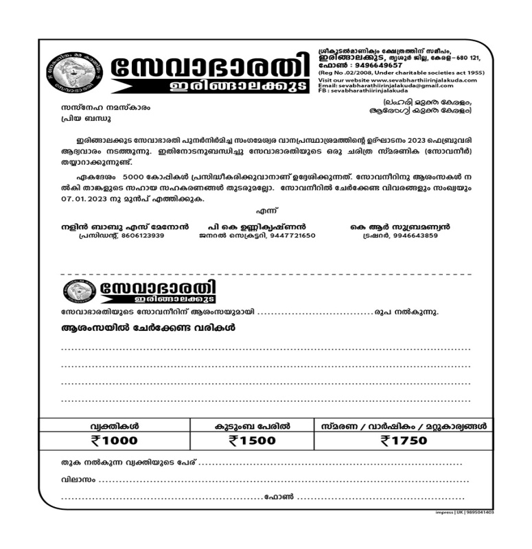 A/C Name : Sevabharathi Irinjalakuda A/C. NO. 32202089541 STATE BANK OF INDIA IRINJALAKUDA BRANCH DOOR NO.V/50 P.B. NO. 32 MAIN ROAD IRINJALAKUDA – 680121. IFSC CODE : SBIN0008618
